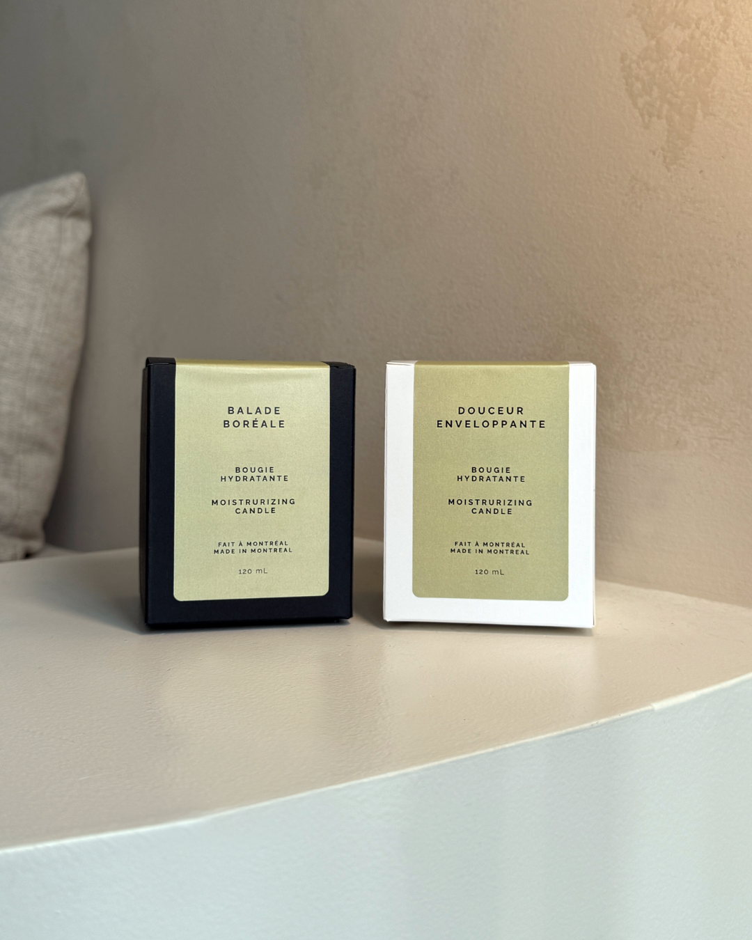 Discover each candle, each with its own unique energy: one stimulates and awakens the senses, while the other soothes and envelops with softness. Together, they create a harmonious ritual, where the mind relaxes, the body is rejuvenated, and the skin is hydrated.